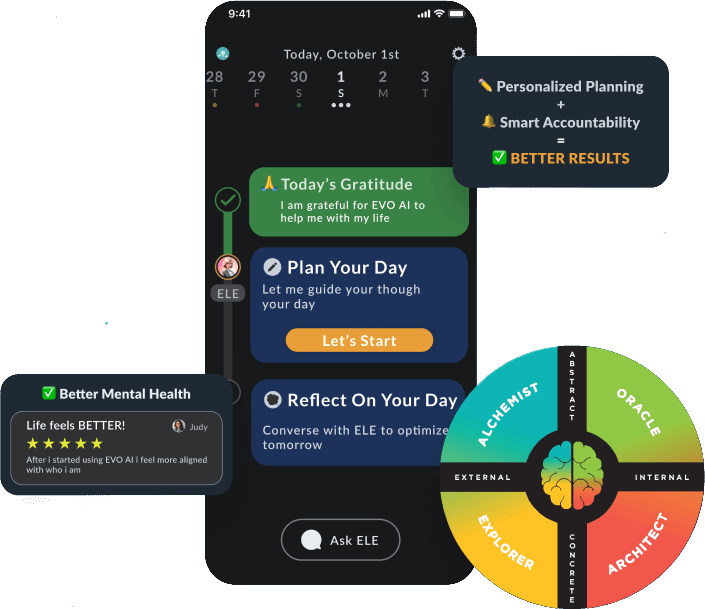 EVO AI (ELE) is a comprehensive iOS app designed to enhance personal productivity and self-awareness through a unique blend of generative AI-driven features and personalized insights. The app is structured around several key modules, each serving a distinct purpose in the user’s journey towards personal growth and efficiency. This case study explores the development and implementation of EVO AI, focusing on innovative use of generative AI, particularly with ChatGPT 4, and the integration of personalized insights based on user behavior and preferences.