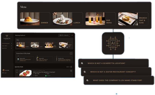 The system integrates with Vanta Hospitality by organizing menu items for prompt generation and utilizing ChatGPT’s pre-trained model. Restaurants maintain full control over the trivia questions through an intuitive interface.